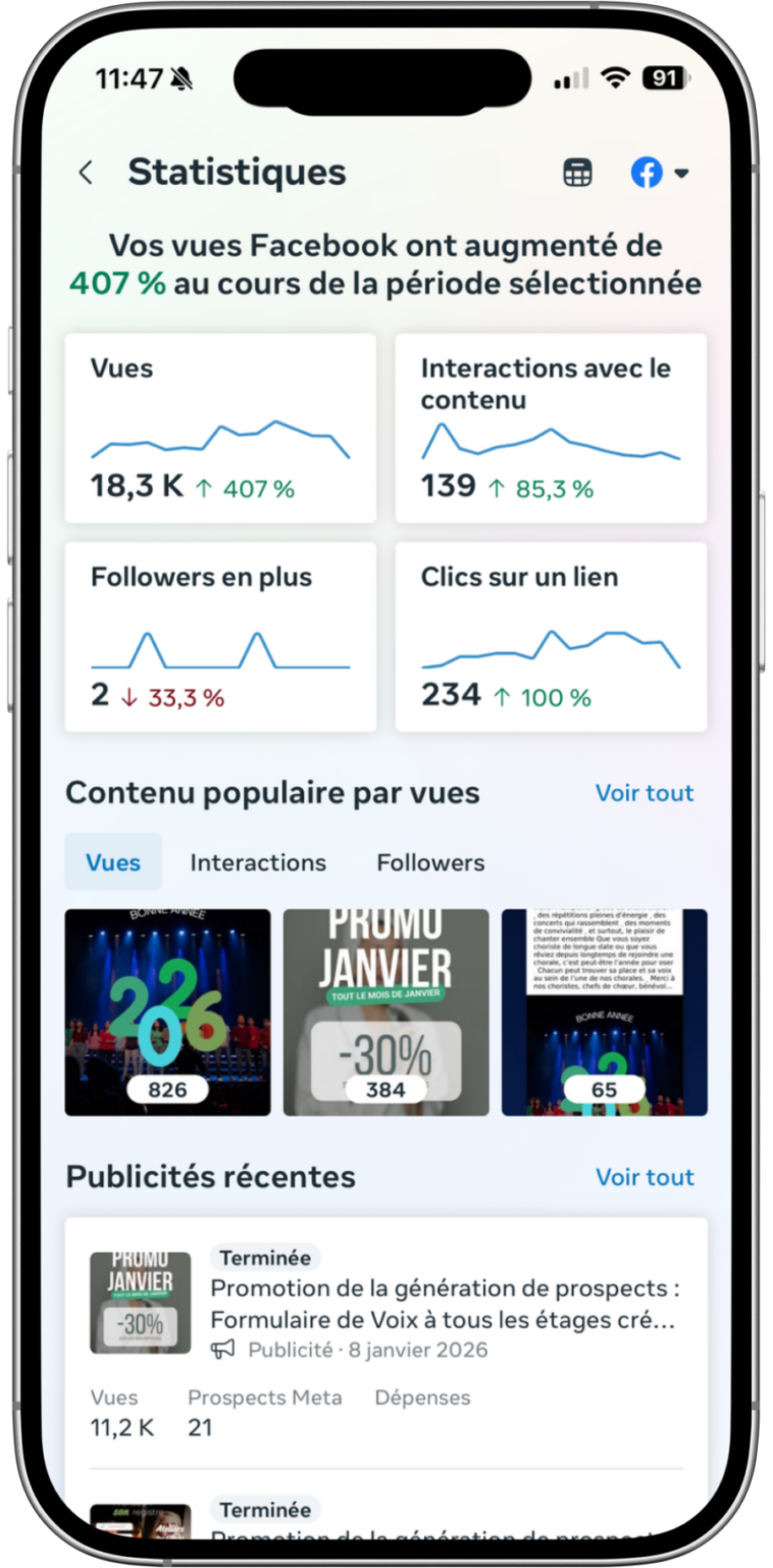 Nous combinons contenus organiques et campagnes Meta Ads pour créer un levier cohérent et rentable, adapté à votre budget et à vos objectifs.